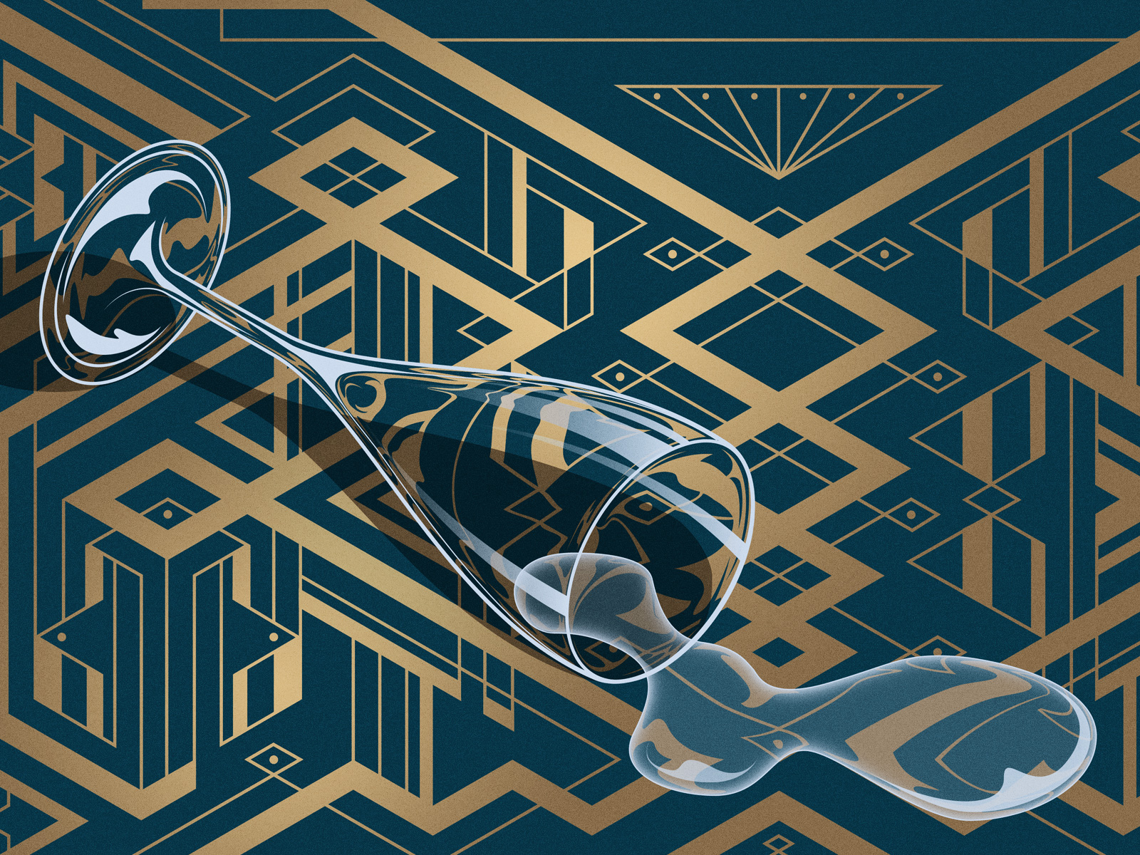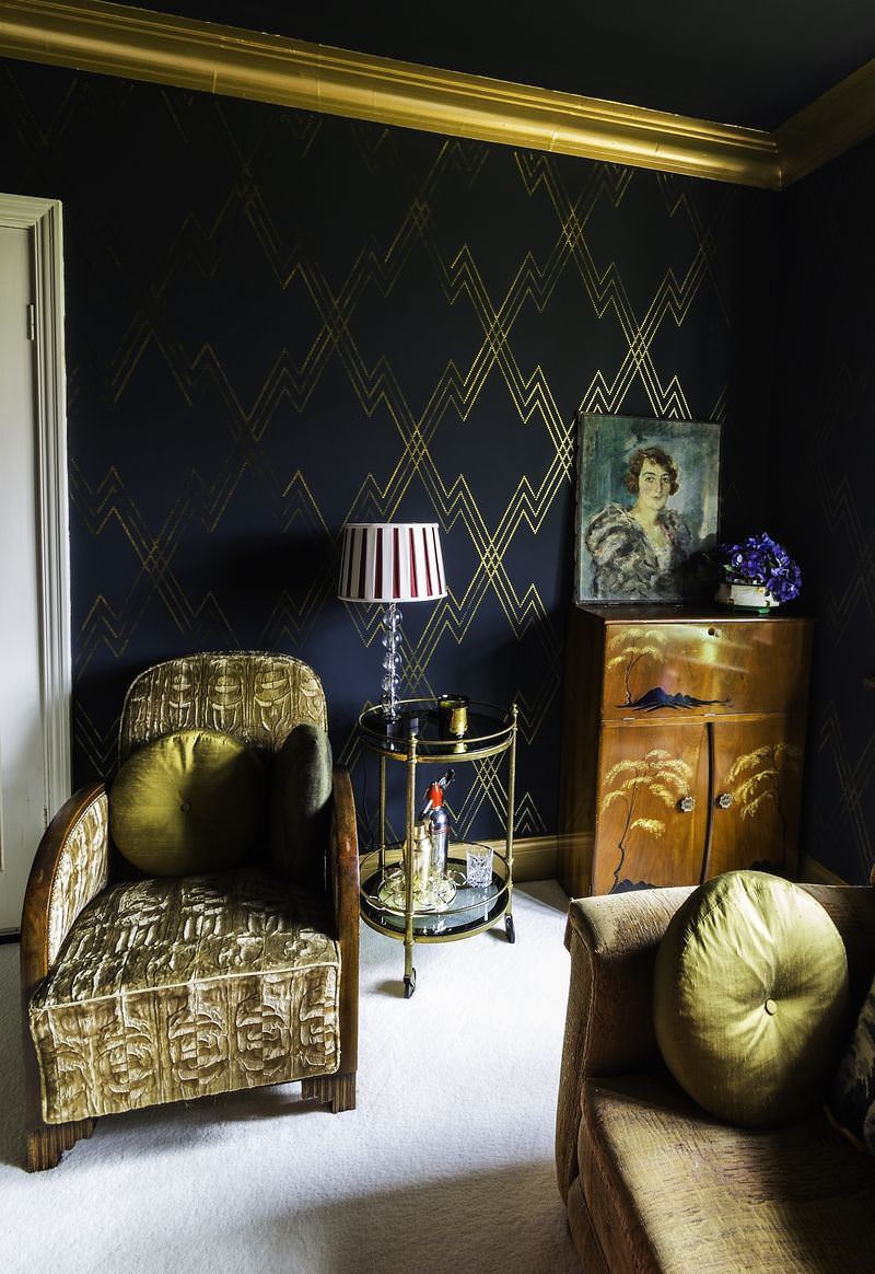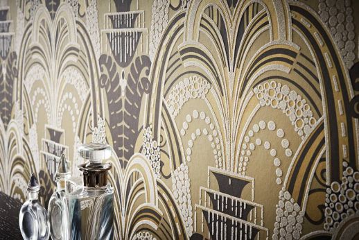 El Hotel Plaza de Nueva York colaboró con Catherine Martin (dirección de arte) para crear una suite estilo años 20 en honor del escritor F. Scott Fitzgerald. Su alfombra estampada, impresionantes contrastes monocromos y papel pintado gris con patrones confiere un lujoso aire Art Deco a este romántico oasis. Este tipo de diseño de interiores crea una atmósfera especial, peligrosa y atractiva, además de glamurosa y nostálgica. Los papeles pintados desempeñan un rol importante en la creación de este aspecto. Los motivos florales o geométricos en la decoración para paredes, los accesorios dorados y muebles antiguos, todo esto contribuye para lograr un fabuloso estilo Art Déco chic.